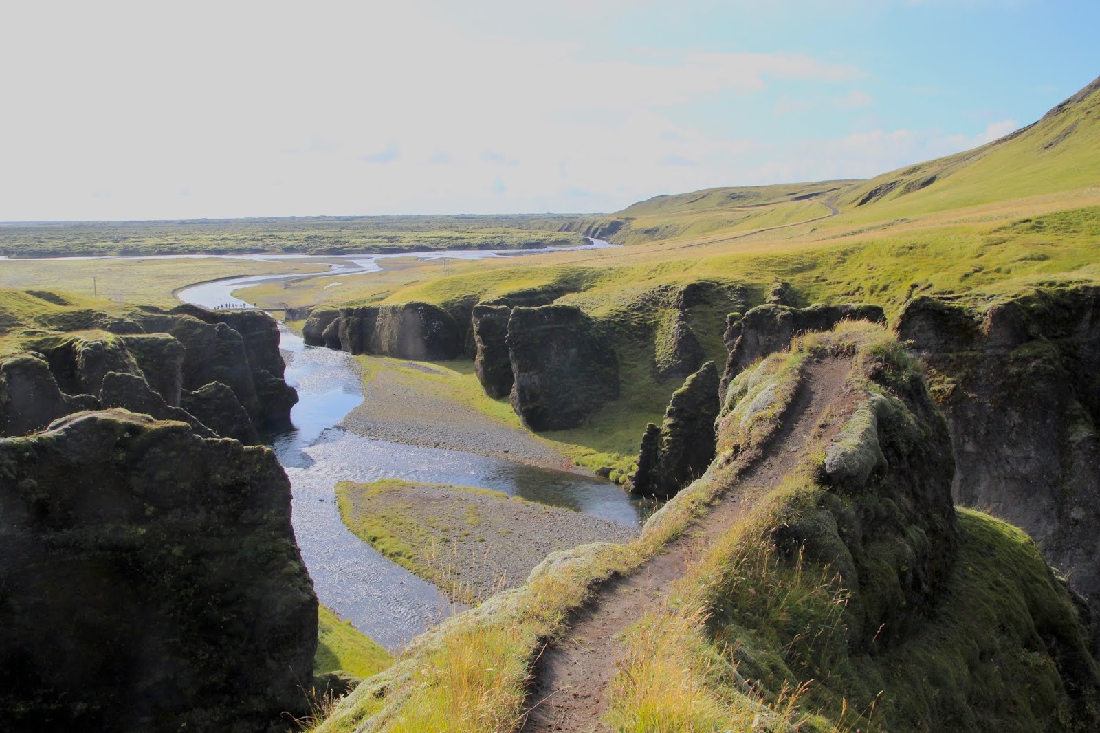 We pack up and drive the five and a half kilometers back to the Ring Road (Road Number One) and head for our first stop. It’s a hike along the rim of the Fjadrarglijufur Canyon. That’s something we haven’t done yet! It’s awe-inspiring! We see a bride and groom getting their wedding photos done and meet a girl with a Siesta Key t-shirt. She’s not American! There are tons of Japanese tourists and a guy with a drone. Marilyn tells him that in the US you have to have a license to fly those. Another man comments that you need a license for a drone but not for an AK-47.
